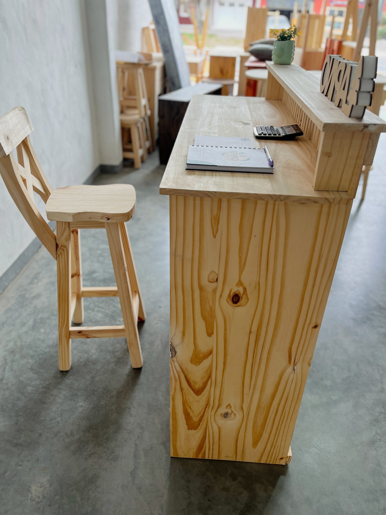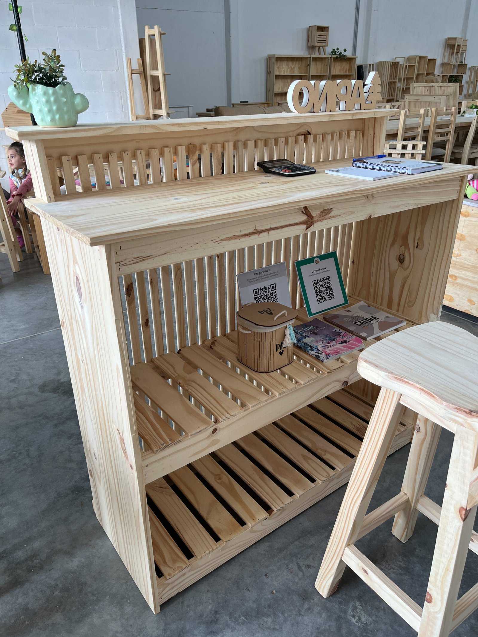 Esta barra mostrador combina funcionalidad y estética natural, ideal para locales comerciales, ferias o espacios de atención al cliente.