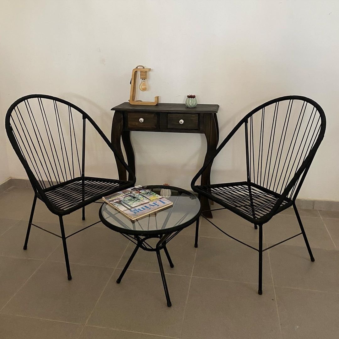 • 🖤 Incluye: 2 sillas metálicas negras con respaldo curvo + 1 mesa redonda con tapa de vidrio templado
