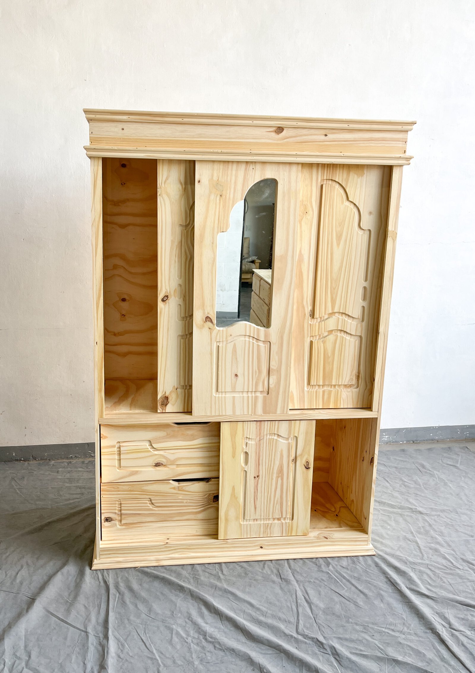 Este ropero de pino macizo es una opción práctica y compacta para optimizar el espacio. Sus puertas corredizas permiten un acceso fácil sin ocupar lugar extra, e incluyen un espejo central que aporta funcionalidad y luminosidad. Cuenta con estantes abiertos, cajones y compartimentos con puertas para organizar ropa, calzado y accesorios. Su diseño clásico con detalles tallados lo hace ideal para dormitorios rústicos o modernos. Puede personalizarse con pintura o barniz para adaptarlo a tu estilo.